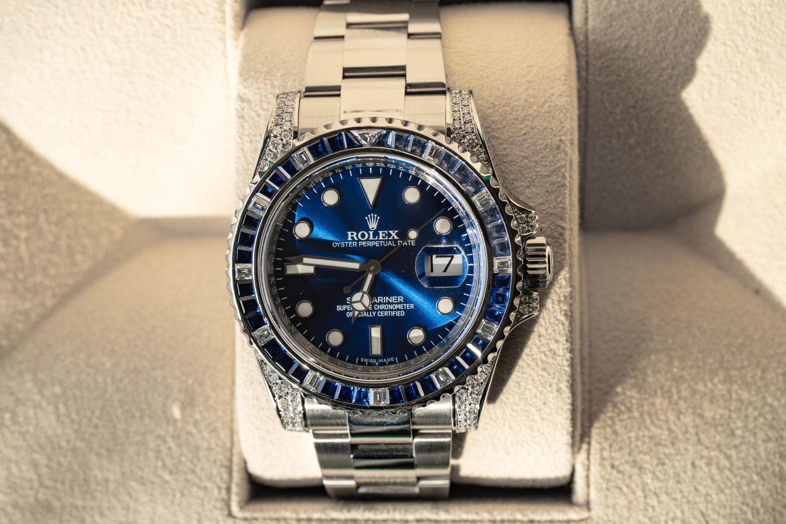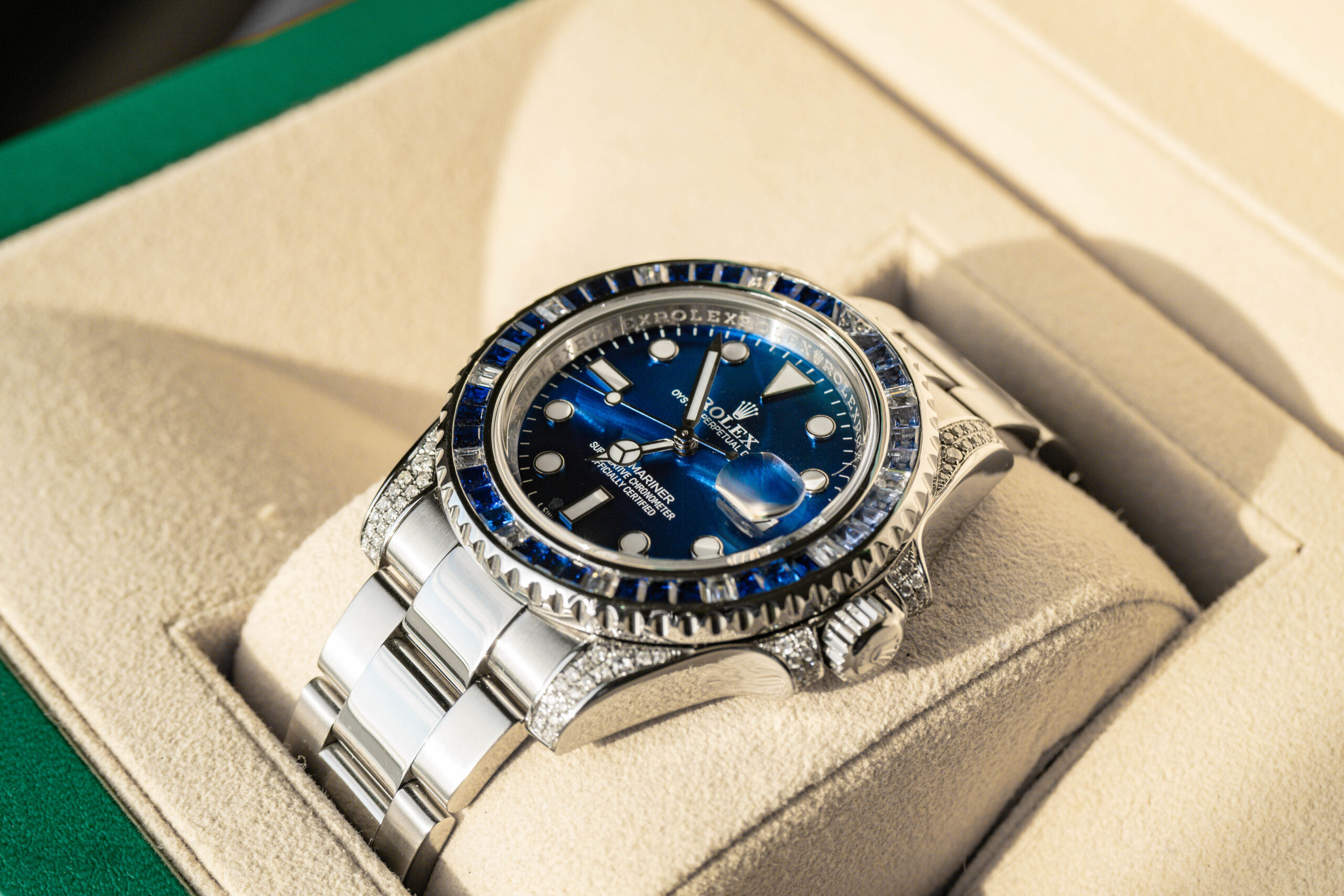 Kleine Sekunde, Leuchtzeiger, Datum, Leuchtindizes, Aftermarket Sapphire und Diamanten
